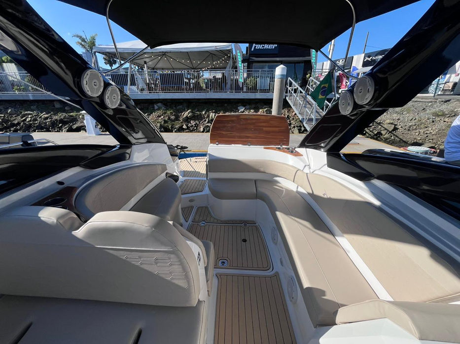• Mesa em teca com porta copo acrílico no cockpit